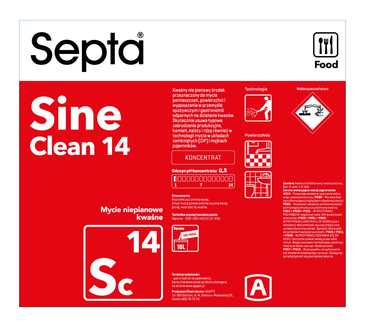 Septa Sine Clean 14 SC14 to niezastąpiony pomocnik w utrzymaniu czystości i higieny w każdym zakładzie gastronomicznym i przetwórstwa spożywczego. Jego skoncentrowana formuła gwarantuje wydajność i skuteczność, a stosowanie zgodnie z zaleceniami producenta zapewnia bezpieczeństwo dla personelu i czyszczonych powierzchni. Produkt ten jest łatwy w użyciu i doskonale sprawdza się w trudnych warunkach, gdzie wymagana jest najwyższa jakość czyszczenia.