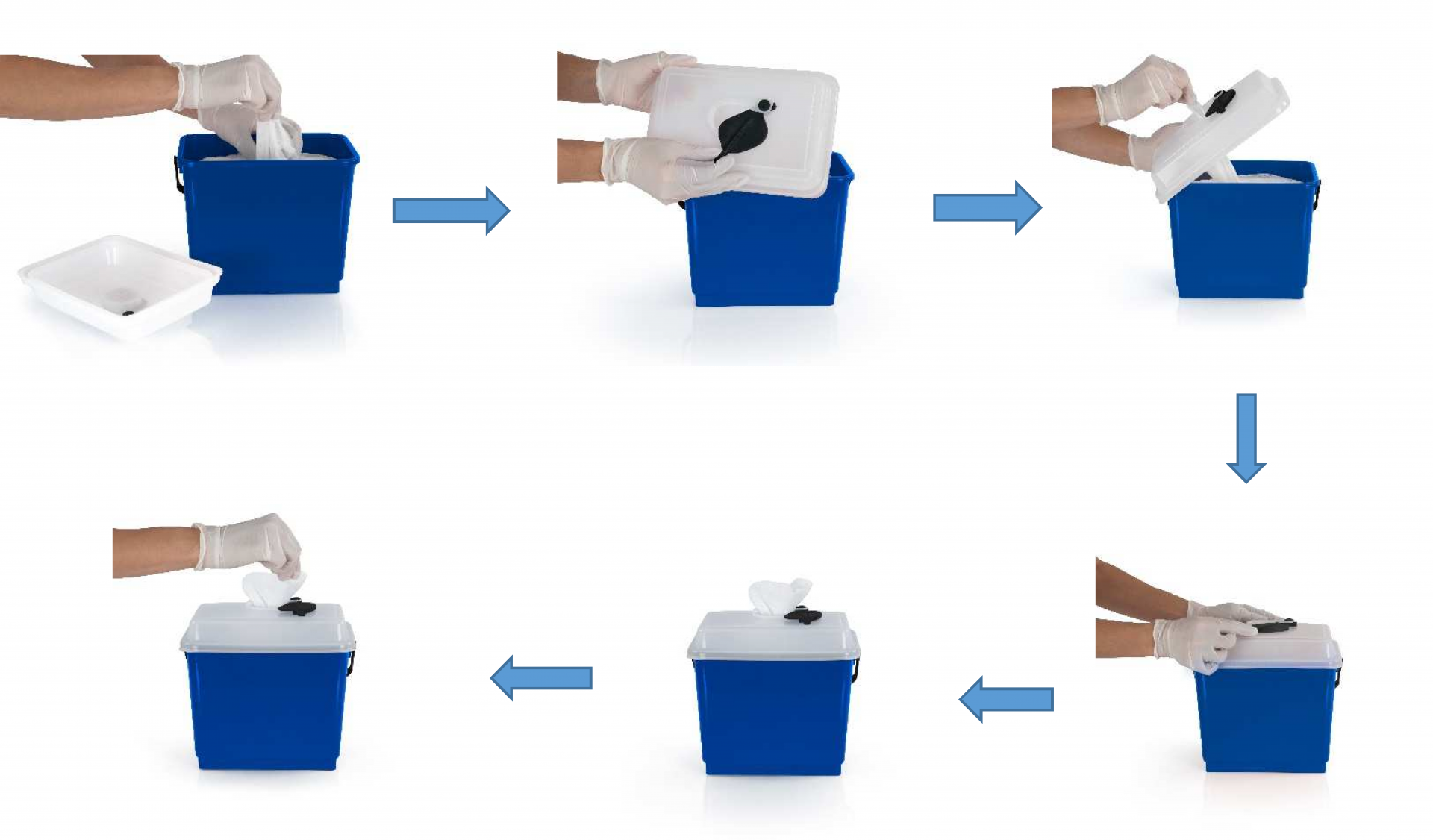 Do pojemnika doskonale pasują ściereczki jednorazowe do dezynfekcji wykonane z wytrzymałej i chłonnej fizeliny, idealne do nasączania dowolnym środkiem do dezynfekcji lub czyszczenia. W przypadku przygotowywania ściereczek do dezynfekcji powierzchni, zaleca się stosowanie produktu Septa Sine Cid 1 H1, w sugerowanej ilości od 1,5 do 1,8 litra roztworu.