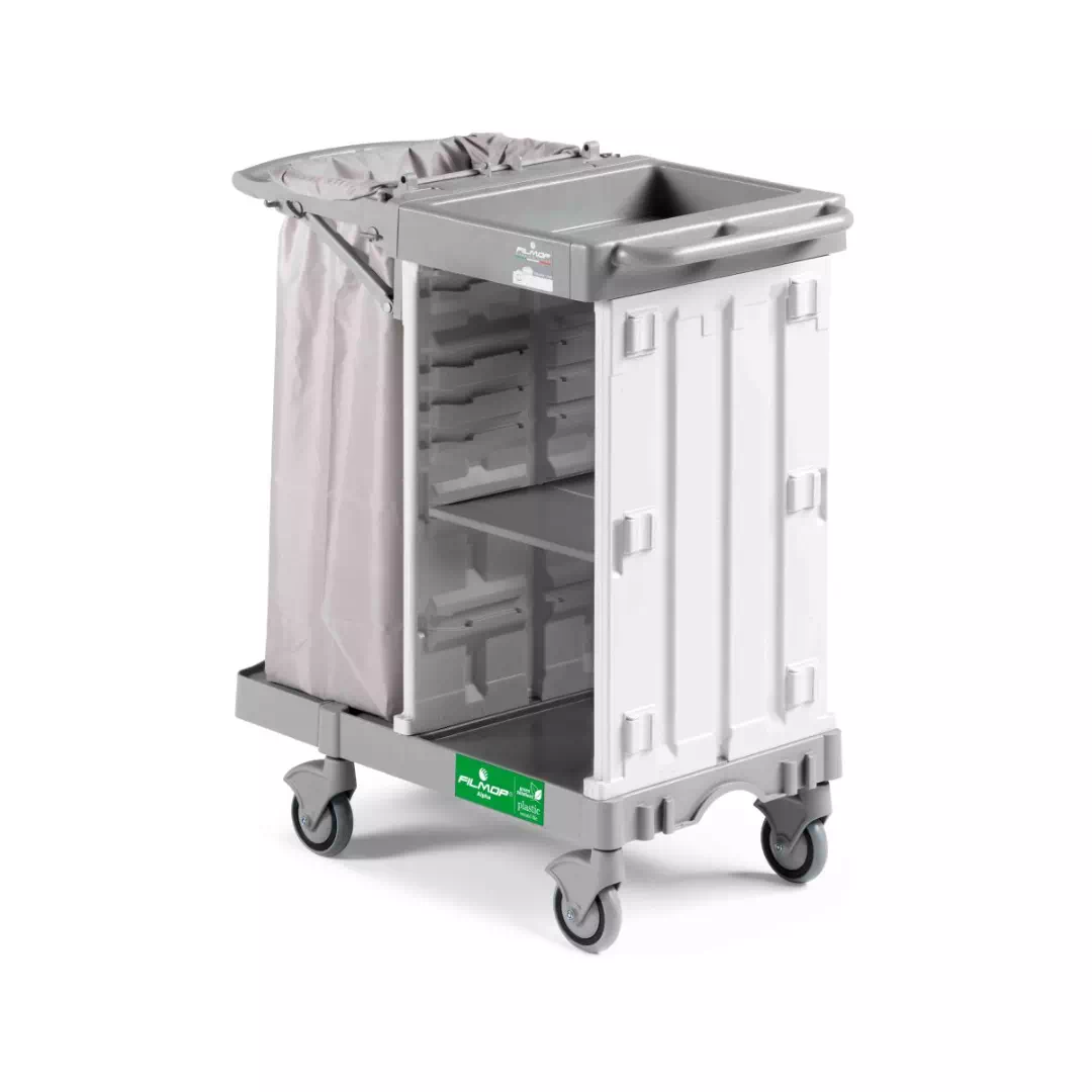 Filmop alpha hotel to profesjonalny wózek hotelowy do transportu czystych ręczników i bielizny oraz zbierania brudnej bielizny w hotelach i pensjonatach. Sugerowany do obsługi od 4 do 5 pomieszczeń, charakteryzuje się maksymalnym udźwigiem wysuwanej półki wynoszącym 15 kg.