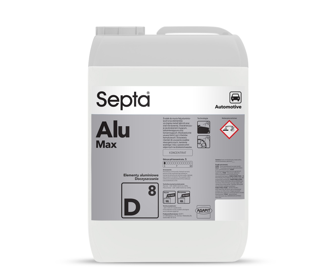 Septa Alumax D8 to niezastąpiony produkt, który łączy w sobie skuteczność, bezpieczeństwo i łatwość użycia. Jego uniwersalność sprawia, że jest idealnym wyborem do czyszczenia felg aluminiowych, elementów metalowych i wielu innych powierzchni, gdzie wymagana jest wysoka jakość czyszczenia oraz ochrona materiału. Dzięki swojej skoncentrowanej formule, jest wyjątkowo wydajny i ekonomiczny w użyciu, co czyni go doskonałym rozwiązaniem zarówno dla profesjonalistów, jak i dla użytkowników domowych ceniących sobie jakość i efektywność.