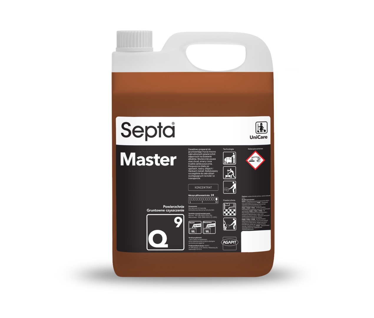 Septa Master Q9 to zasadowy preparat do gruntownego mycia mocno zabrudzonych powierzchni odpornych na działanie alkaliów. Skutecznie usuwa stary brud, smary i inne trudne zanieczyszczenia. Rozpuszcza ślady po oponach, sadzy, olejach i tlenkach metali. Profesjonalna chemia czyszcząca dedykowana szczególnie do zabrudzeń występujących na kolei i w transporcie.